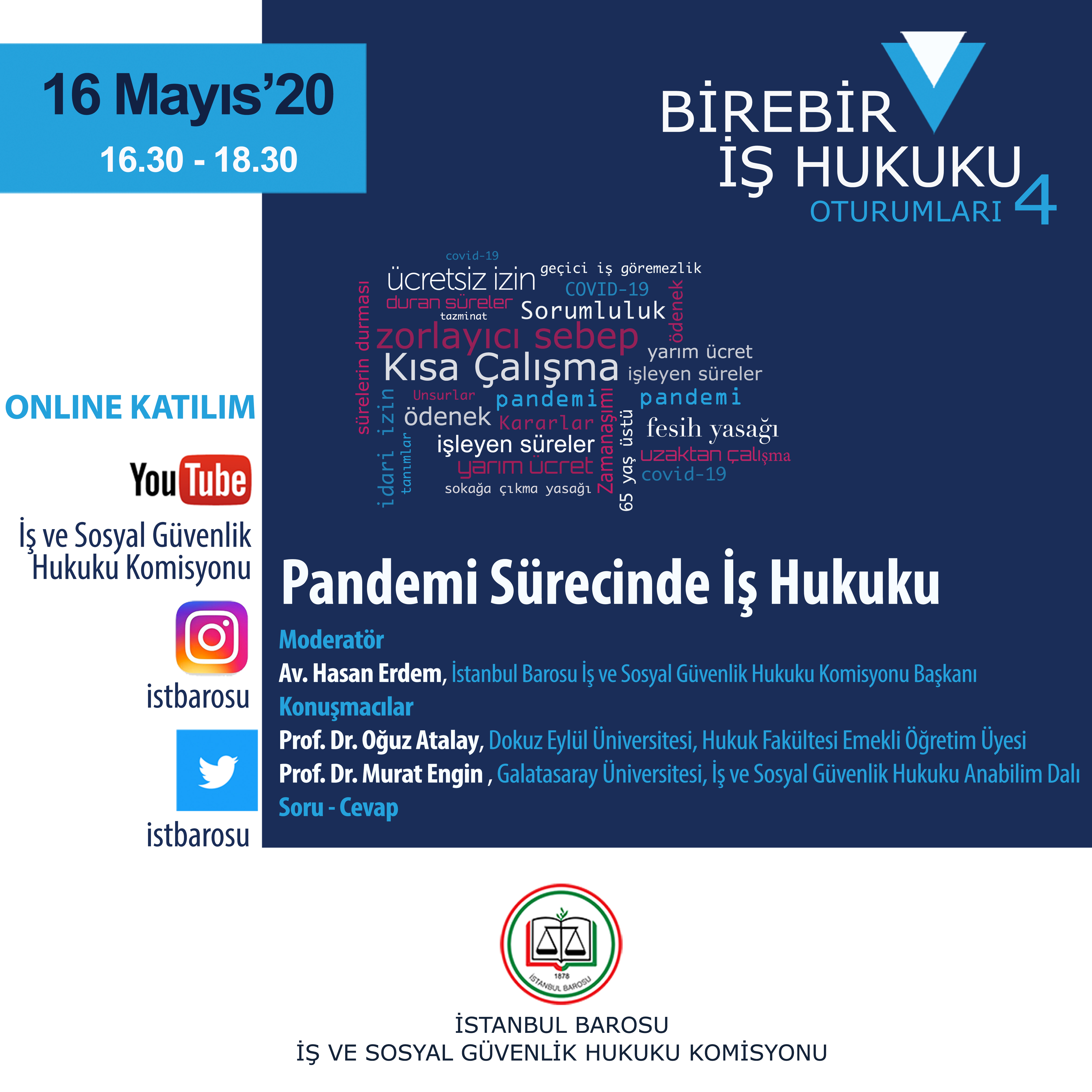 İstanbul Barosu İş ve Sosyal Güvenlik Hukuku Komisyonu’nun düzenlediği, ”Pandemi Sürecinde İş Hukuku’’ konulu yayın 16 Mayıs 2020 Cumartesi günü online olarak gerçekleşecektir.