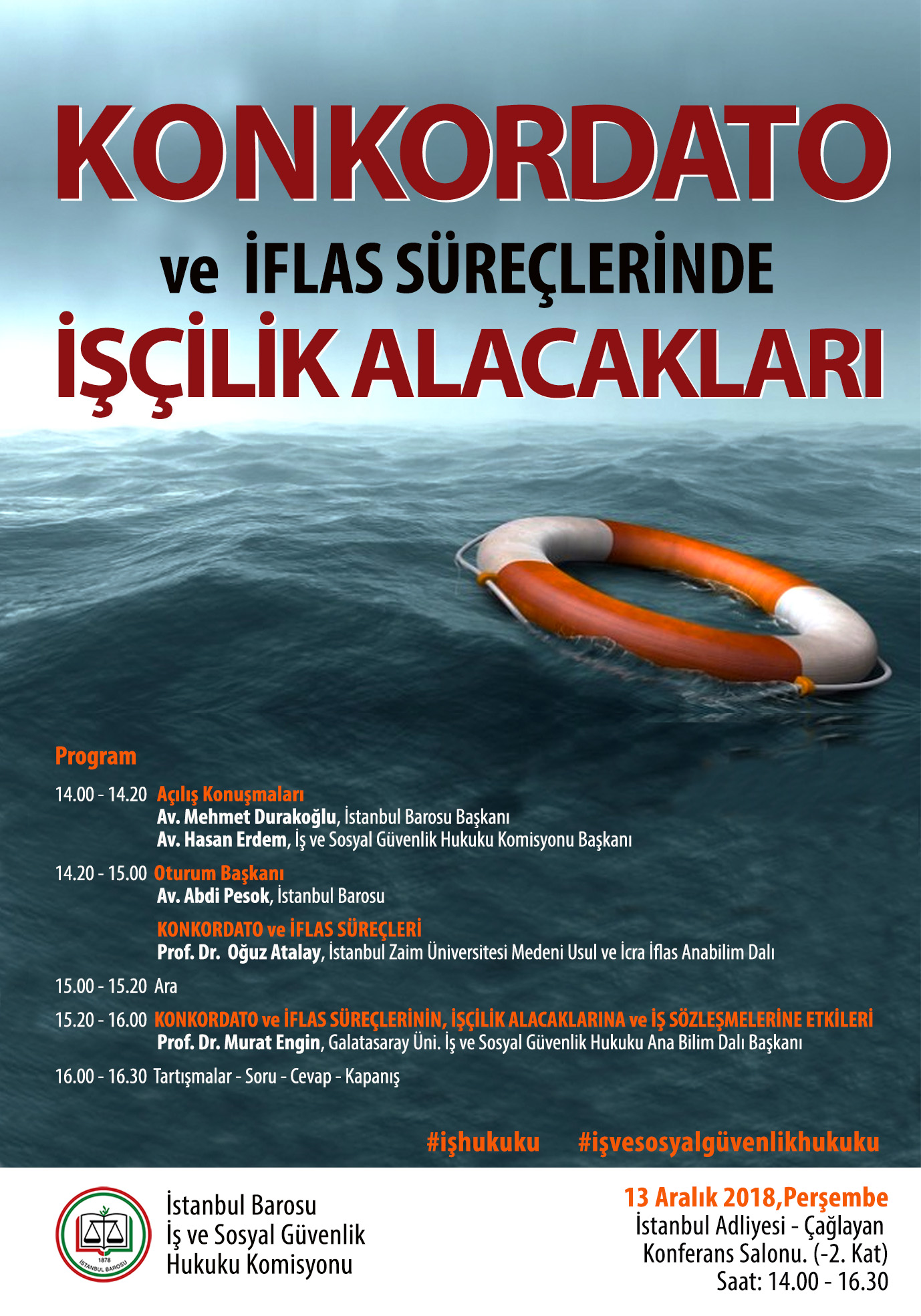 İstanbul Barosu İş ve Sosyal Güvenlik Hukuk Komisyonunca düzenlenen ‘Konkordato ve İflas Süreçlerinde İşçilik Alacakları’ konulu panel, 13 Aralık 2018 Perşembe günü saat 14.00’da İstanbul Adalet Sarayı Konferans Salonunda gerçekleştirildi.