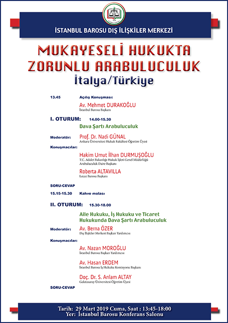 İstanbul Barosu Dış İlişkiler Merkezince düzenlenen ‘Mukayeseli Hukukta Dava Şartı Arabuluculuk’ konulu panel, 29 Mart 2019 Cuma günü saat 14.00’da baromuz merkez bina konferans salonunda yapıldı.