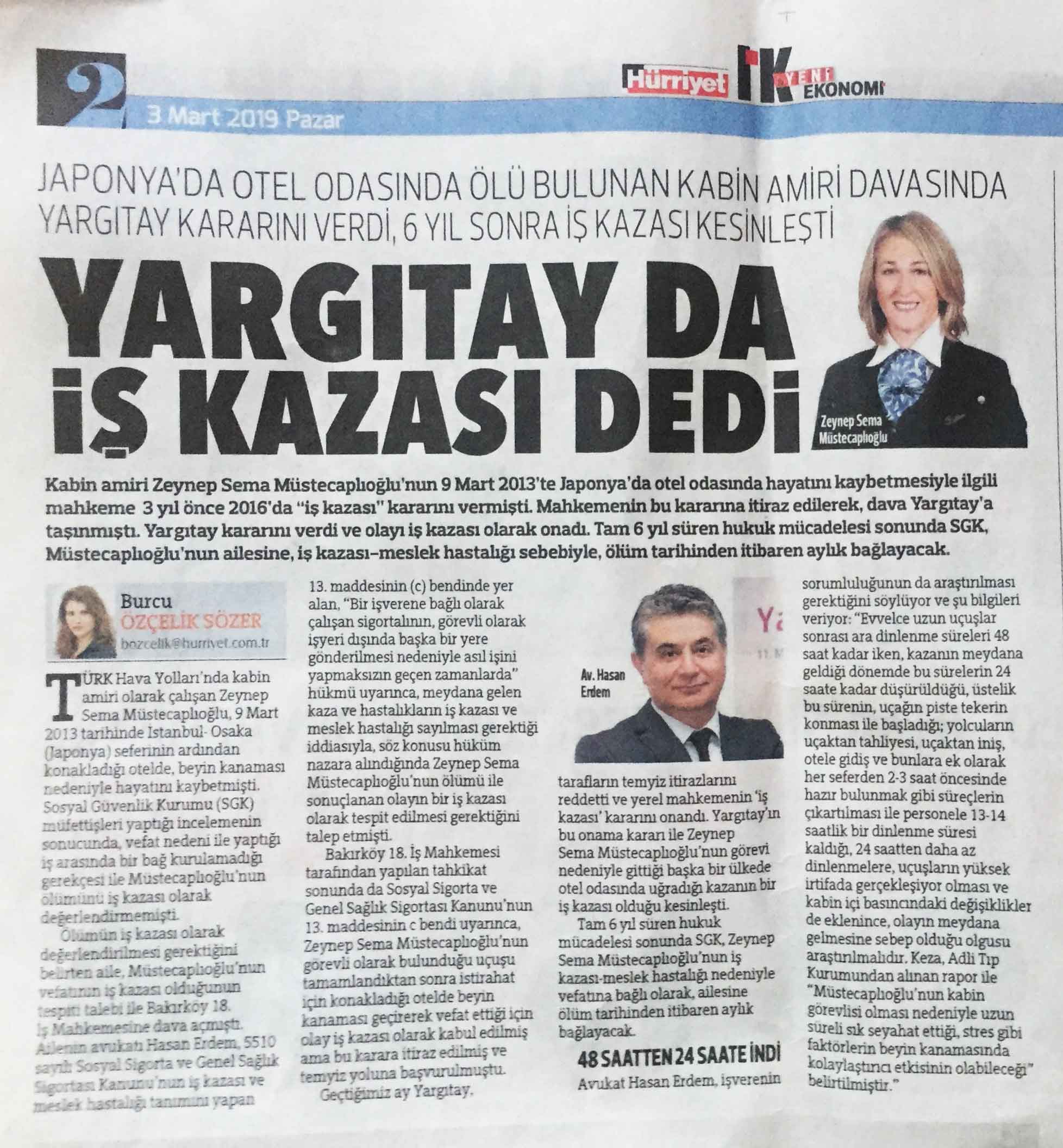 Kabin amiri Zeynep Sema Müstecaplıoğlu’nun 9 Mart 2013’te Japonya’da otel odasında hayatını kaybetmesiyle ilgili mahkeme 3 yıl önce 2016’da “iş kazası” kararını vermişti. Mahkemenin bu kararına itiraz edilerek, dava Yargıtay’a taşınmıştı. Yargıtay kararını verdi ve olayı iş kazası olarak onadı. Tam 6 yıl süren hukuk mücadelesi sonunda SGK, Müstecaplıoğlu’nun ailesine, iş kazası-meslek hastalığı sebebiyle, ölüm tarihinden itibaren aylık bağlayacak.